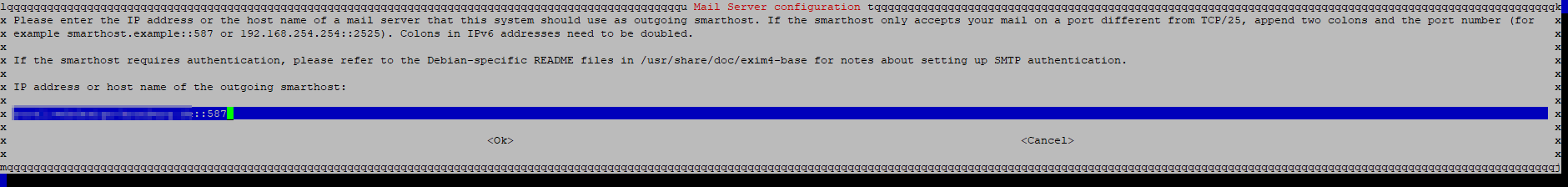 - Enter the smarthost where the Mails should be sent to. If you want secure access add SSL/TLS Port at the end. Example