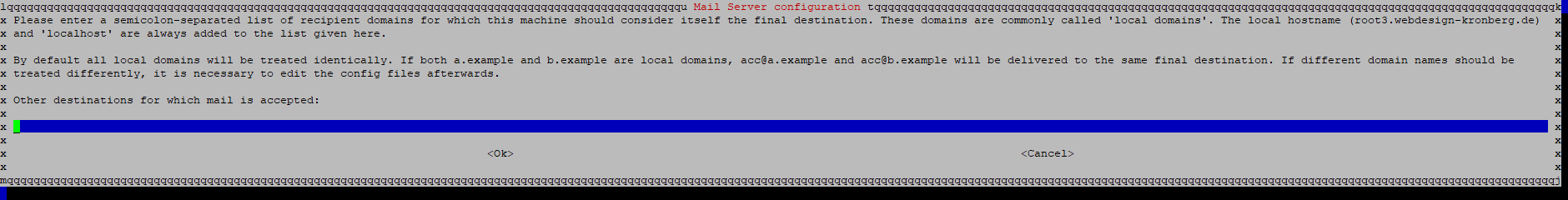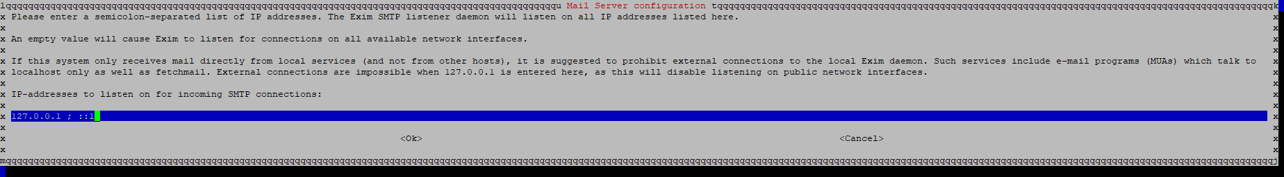 127.0.0.1 ; ::1because there will be no local E-Mail so there won't be incoming SMTP Connections. - Leave this empty. The hostname will be added automatically.