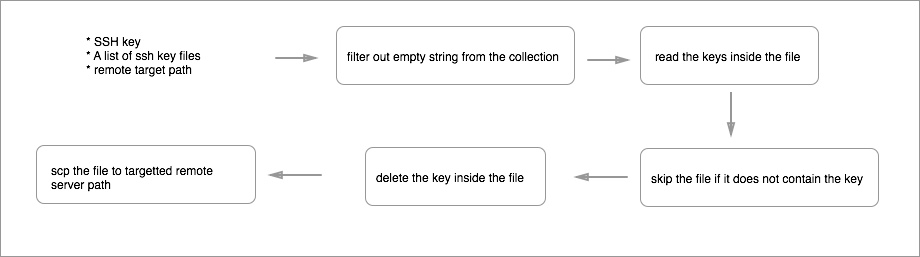The add_user_key and remove_user_key function takes 3 arguments: ssh_key, files_list, and path. Like the function deploy_all, this function passes the input from one function into another until finally the last function syncs the file with the remote server.