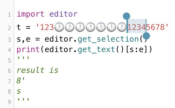 selected_text (and also editor.get_selection) is incorrect. It does not take in account real length of such strings.
