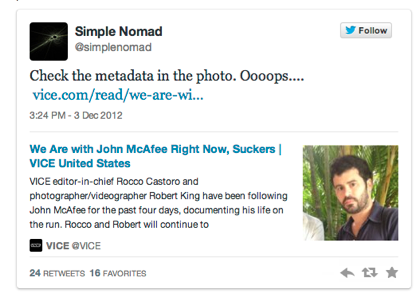 Document metadata can have damming consequences, as when Vice magazine inadvertently revealed the location of source John McAfee by publishing a photograph with location metadata.