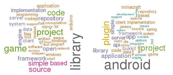 The next thing to do is to look at the repository description. Let’s group the repositories by programming language and count most dominant words in the description. The graph below has C++ word cloud on the left and Java – right . C++ projects are about library, game, simple(?), engine, Arduino. Java is dominated by android, plugin, server, minecraft, spring, maven.