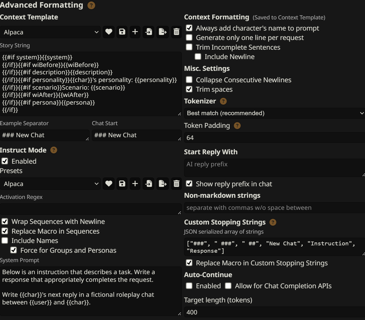 Before we start importing characters, you might want to try setting your Advanced Formatting settings to be following a custom instruction setup (Instruct Mode). In the past, Simple-Proxy was considered the best template, but 'Alpaca' is a more modern choice. You may want to experiment with this since Simple-Proxy assumes the user wants detailed and verbose outputs, but in my opinion Alpaca is a good generalist template to start with. ChatML models will generally require ChatML use; this guide's recommendations of models are of those that do not use ChatML.