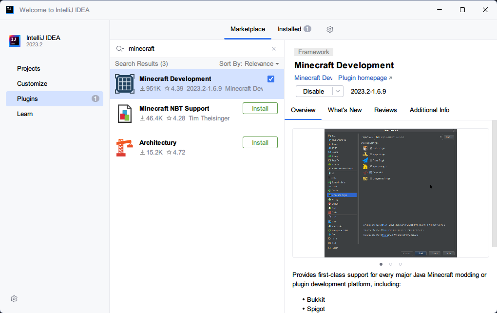 To install Minecraft Plugin Development, open IntelliJ, go to File > Settings > Plugins, type "Minecraft" in the Marketplace tab and install the plugin.