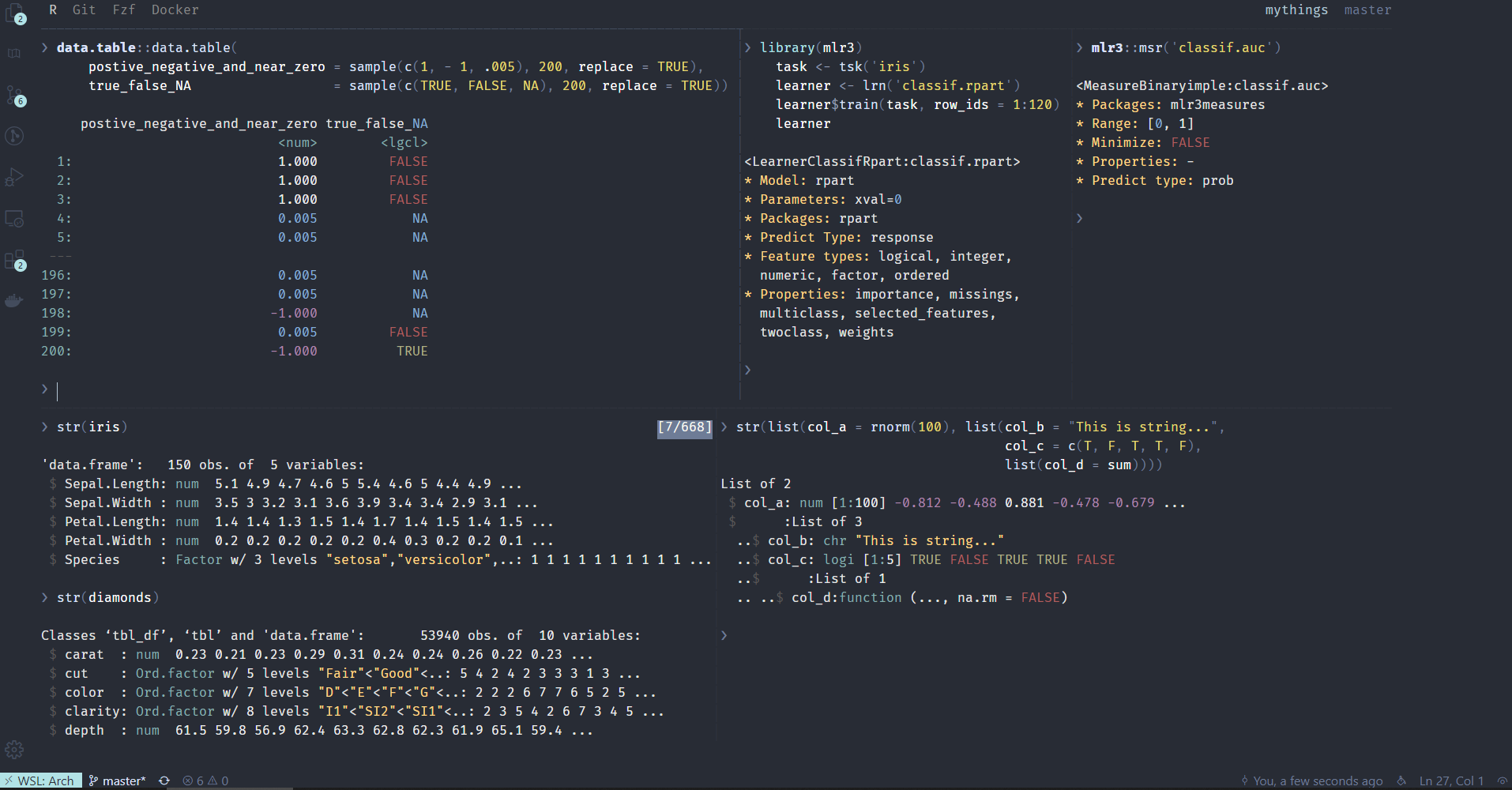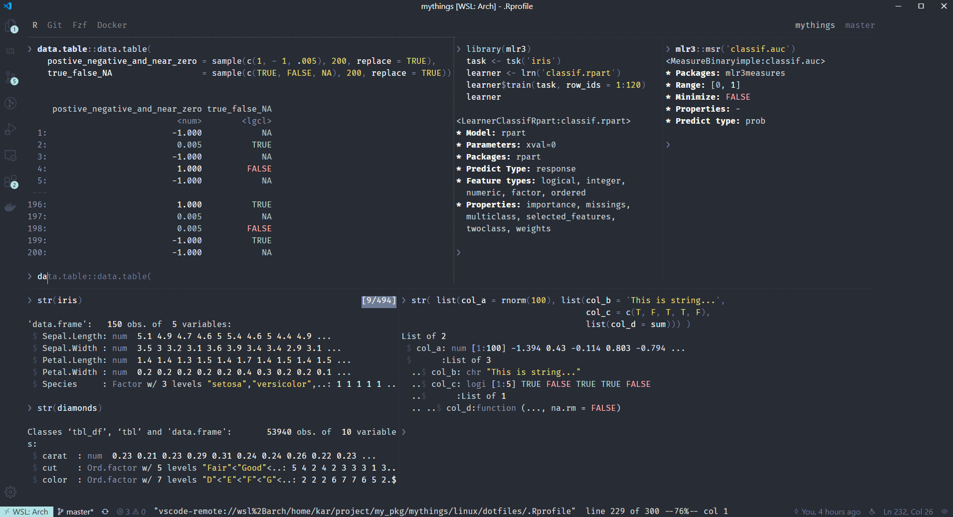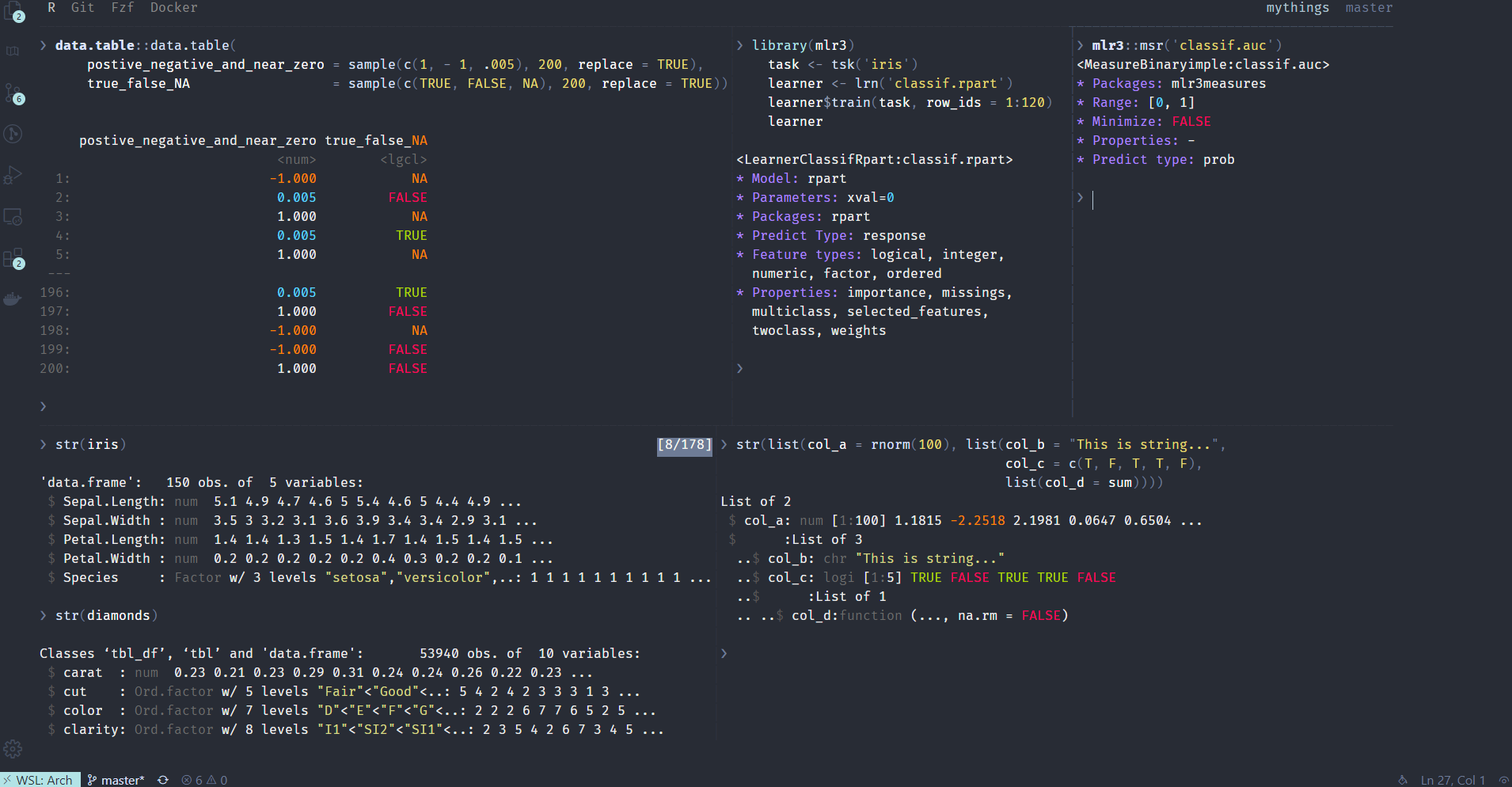 rm(theme, to_ansi)My .Rprofile has slightly different styles than above and it works slightly better with my color codes. For example, I prefer minimalistic styles & colors and, it's meant for differentiating things that are supposed to be differentiated. Feel free to use it.