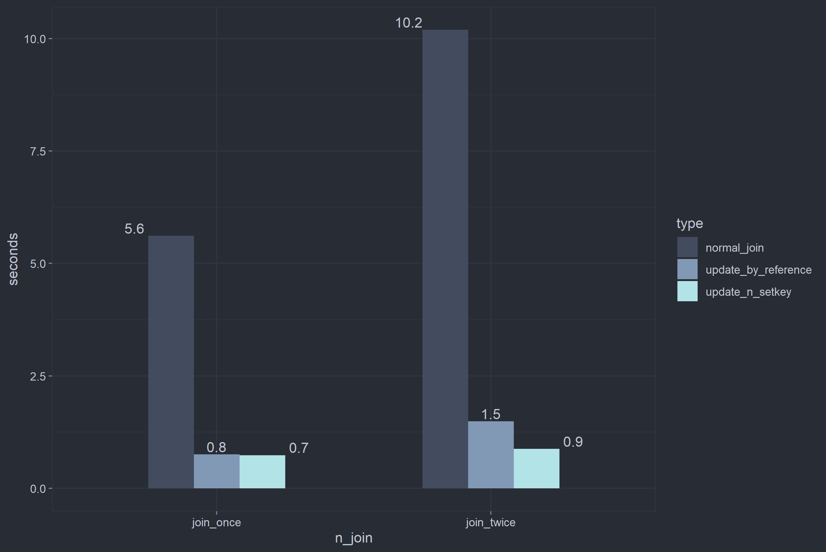 • on second and subsequent joins, as setkey is not required, setkey + update is faster than update by ~1.8 times (or faster than normal join by ~11 times)