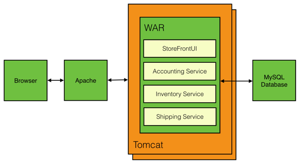 The diagram below is Acmezon’s application deployment model, as described by microservice guru Chris Richardson.