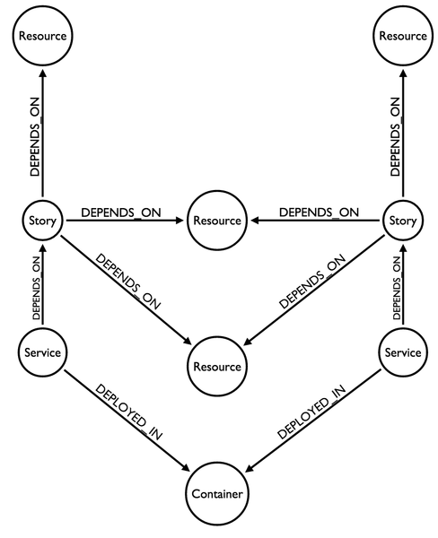 Below you will find an example graph data model of the service dependencies shared between containers, services, resources, and user stories that describe product features.