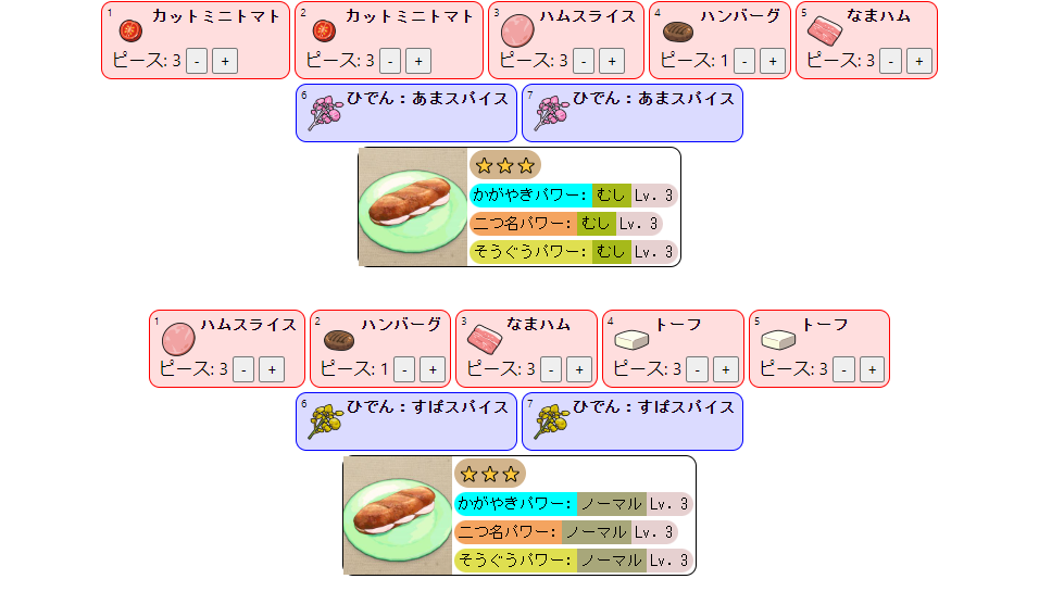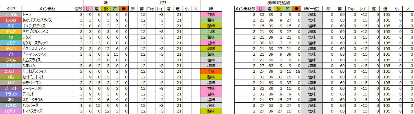 タイプ別のメイン具材と合わせて5つ(遭遇パワー+105)になるレシピとなっています。