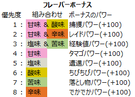 フレーバーボーナスは素材合計の味の内、数値の上位1位、2位の組み合わせで決まります。