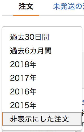 「非表示にした注文」がある場合、注文履歴の期間選択部分が以下の画像のようになり、