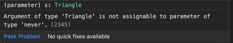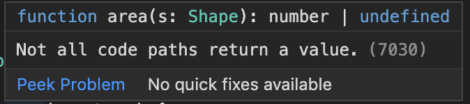 So what's happening here? This is a feature called exhaustiveness checking, and it's one of the killer features of using discriminated unions in your code. TypeScript is making sure you have handled all cases of Shape in your area function.