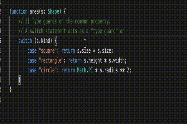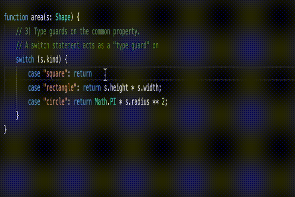 }First, we need a discriminant. In this example, the kind property acts as the discriminant (as string literals like "square" are singleton types). Second, we need a type alias that takes a union of those types, which we do on line 20 with the type alias Shape.