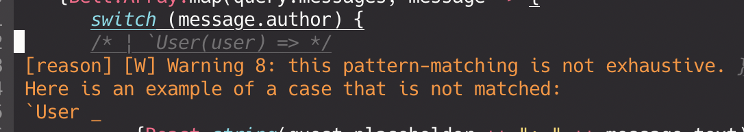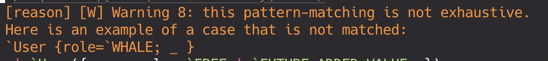 Reason is telling us we forgot to handle our whales! We can crutch on the compiler to help us remember all of the edge cases of our domain.