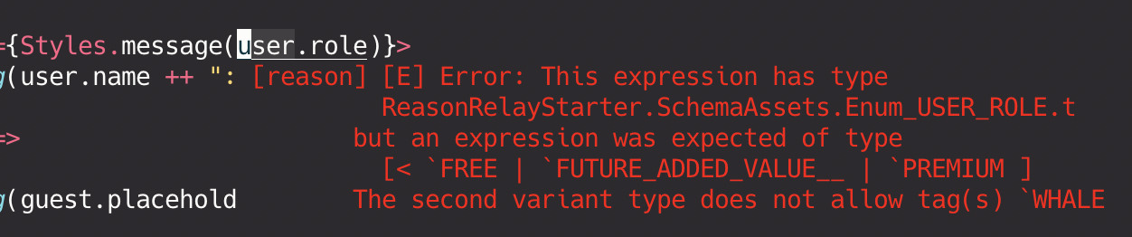 };Just like normal variants, we can also pattern match on polymorphic variants! In ReasonRelay, our union types are decoded as polymorphic variants that we can pattern match off of. Just like the TypeScript examples, the type is narrowed in each case, and the compiler will yell at us if we happen to miss any patterns.