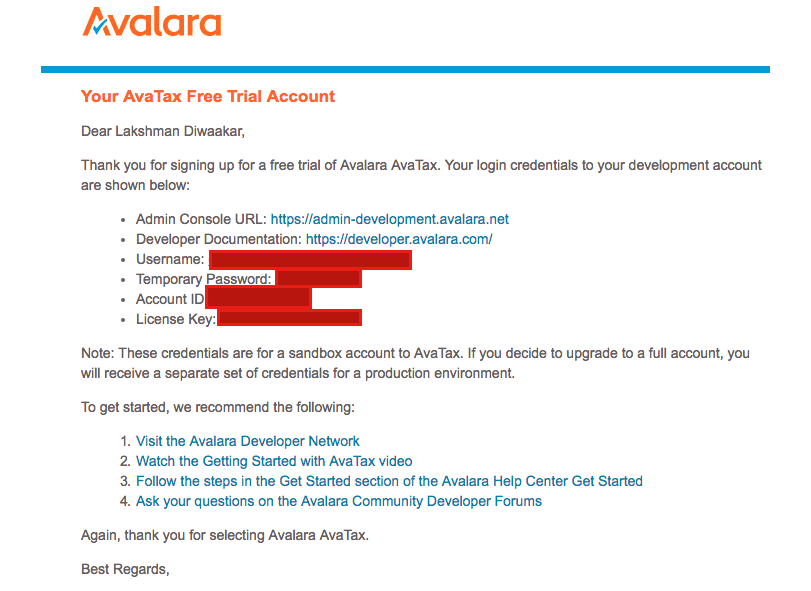 Once you have filled the form from above link, you will get an e-mail containing temporary credentials to login the avalara account. The e-mail will look something like this: