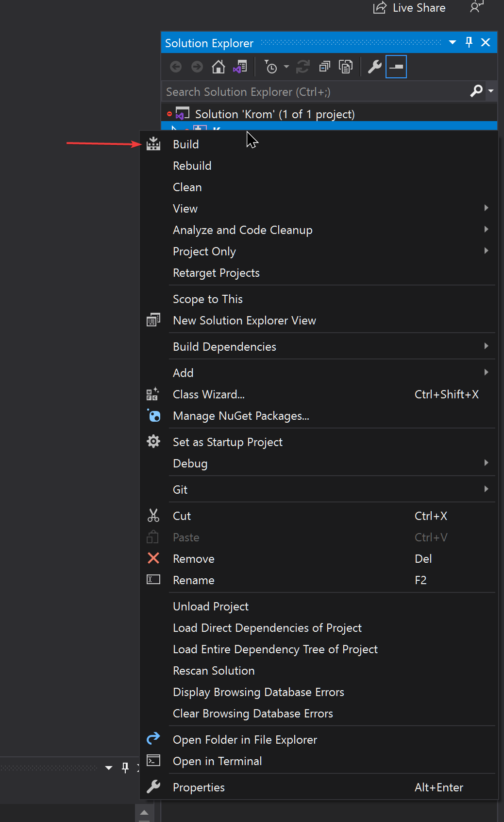 Now right click the Krom folder in Solution explorer and then click Build