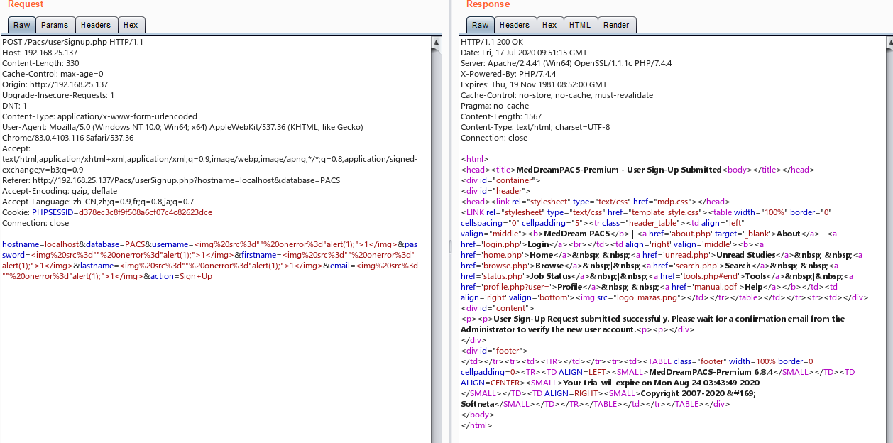 Pacs/userSignup.phpwhen a user sign up, administrator need to review the user. due to no proper sanitization, attacker can insert a xss payload, when admin login to review user sign up requests, will trigger this sotred xss vuln.