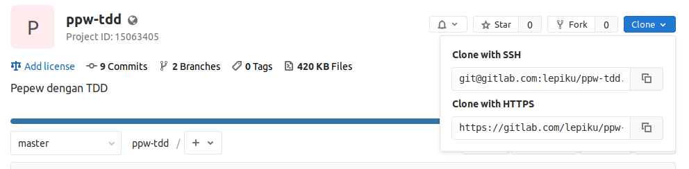 - Kemudian klik tombol clone untuk mendapatkan link gitlab yang https.