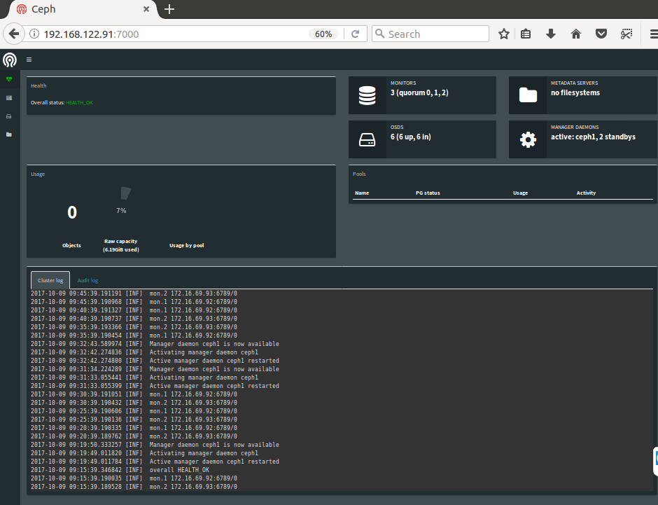cluster: id: ddb94b0b-f4f2-4792-a0c5-adc0e84eaca2 health: HEALTH_OK services: mon: 3 daemons, quorum ceph1,ceph2,ceph3 mgr: ceph1(active), standbys: ceph2, ceph3 osd: 6 osds: 6 up, 6 in data: pools: 0 pools, 0 pgs objects: 0 objects, 0 bytes usage: 6337 MB used, 85216 MB / 91553 MB avail pgs: -