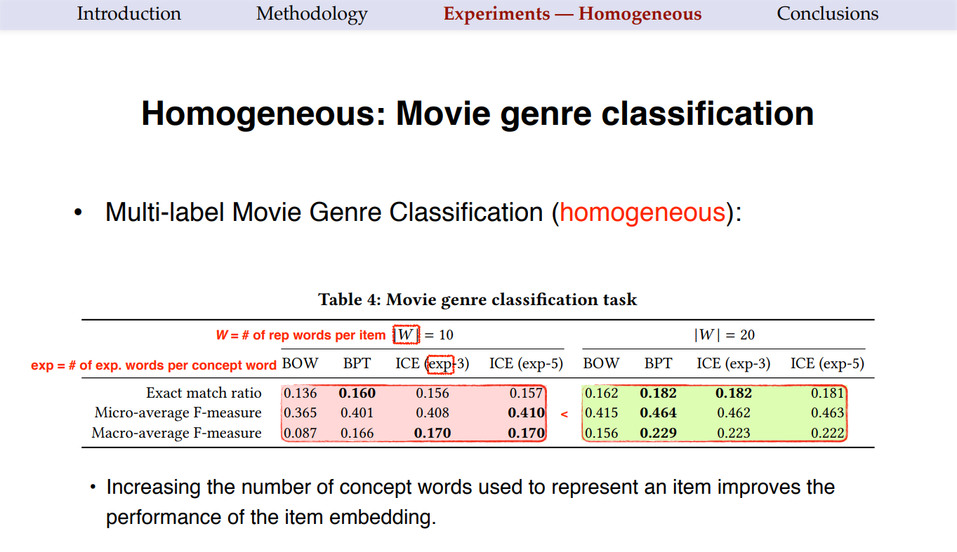 例如一首歌、一部電影? 他提出一個Item Concept Embedding,能比較好的表示item,將有益於推薦系統、IR、分類等各式各樣議題。
