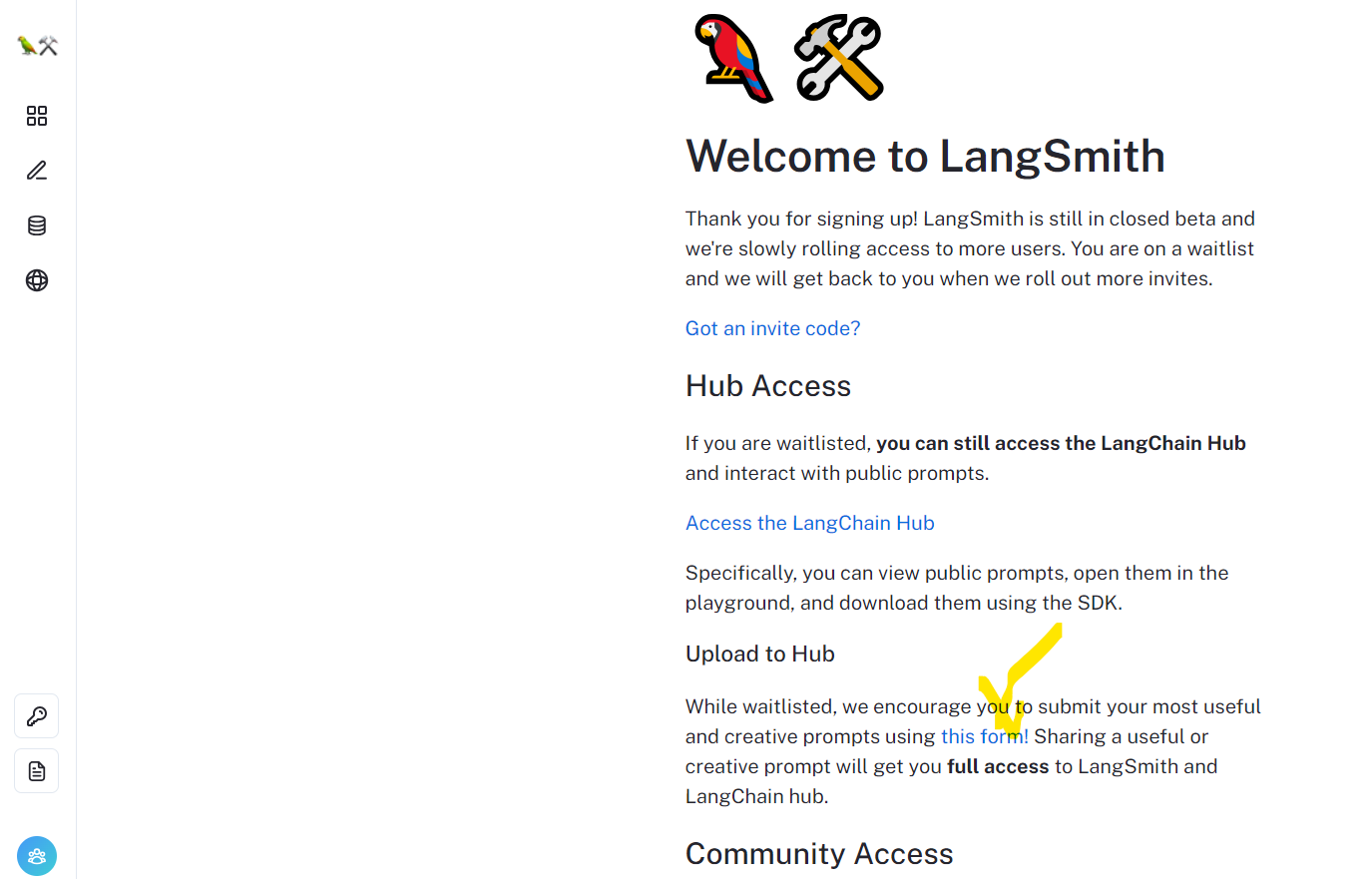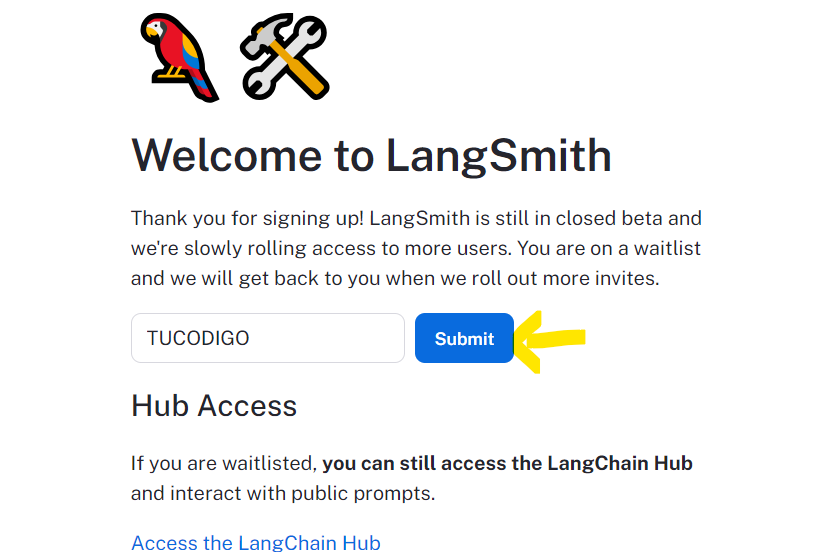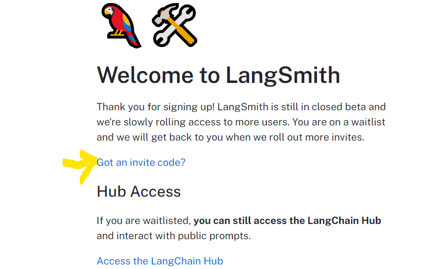 Una vez que recibimos el código de invitación, accedemos con nuestra cuenta a LangSmith y le damos clic en Got an invite code?