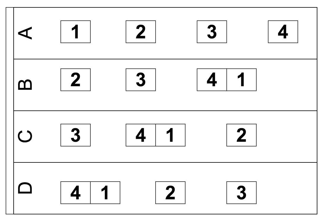 A:1 2 3 4 1 2.... B:2 3 4 1 2 3.... C:3 4 1 2 3 4.... D:4 1 2 3 4 1....