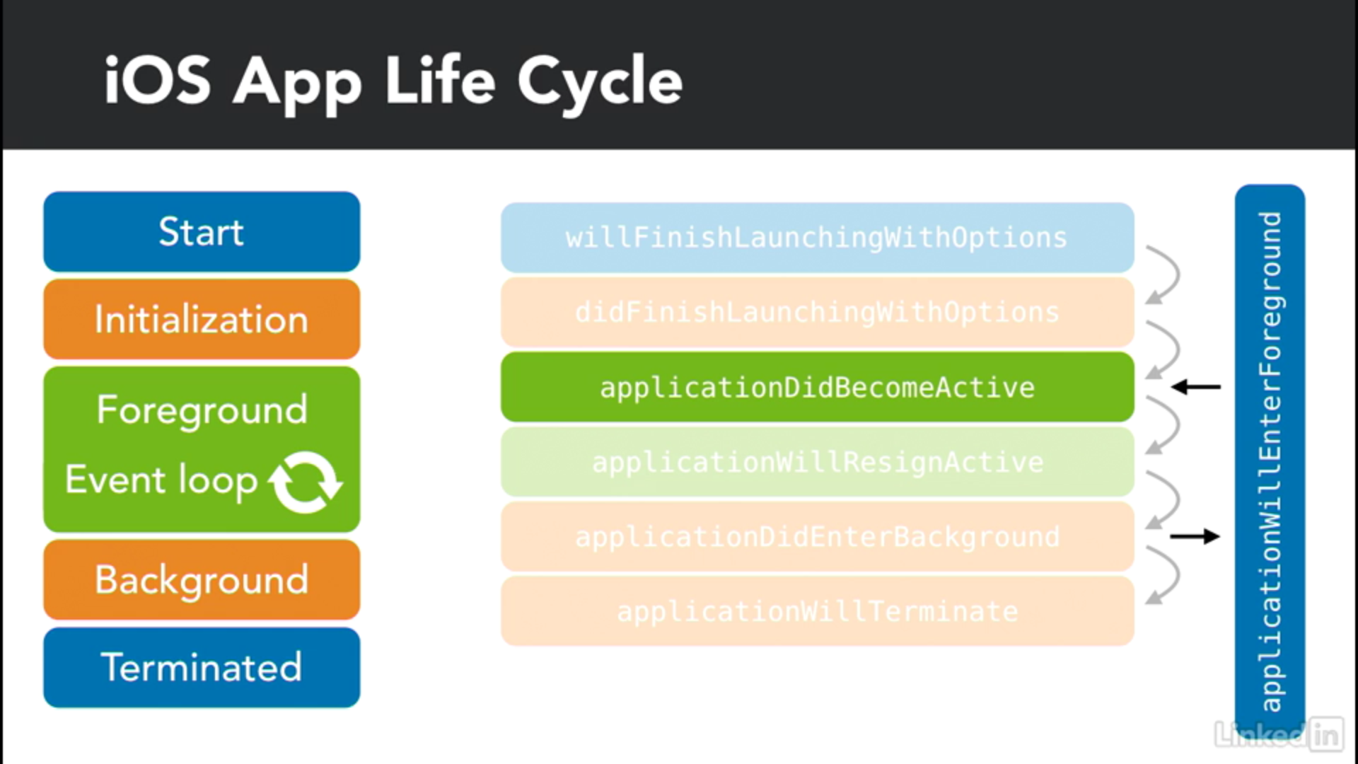 willFinishLaunchingWithOptions: the initiation of UI and resourcesapplicationWillResignActive: Save data before app moves to the backgroundapplicationWillTerminate: This method is different from Android and may not be called. Hence it is not recommended to do any cleanup / saving of state here. Cleanup must happen earlier in the life cycle.