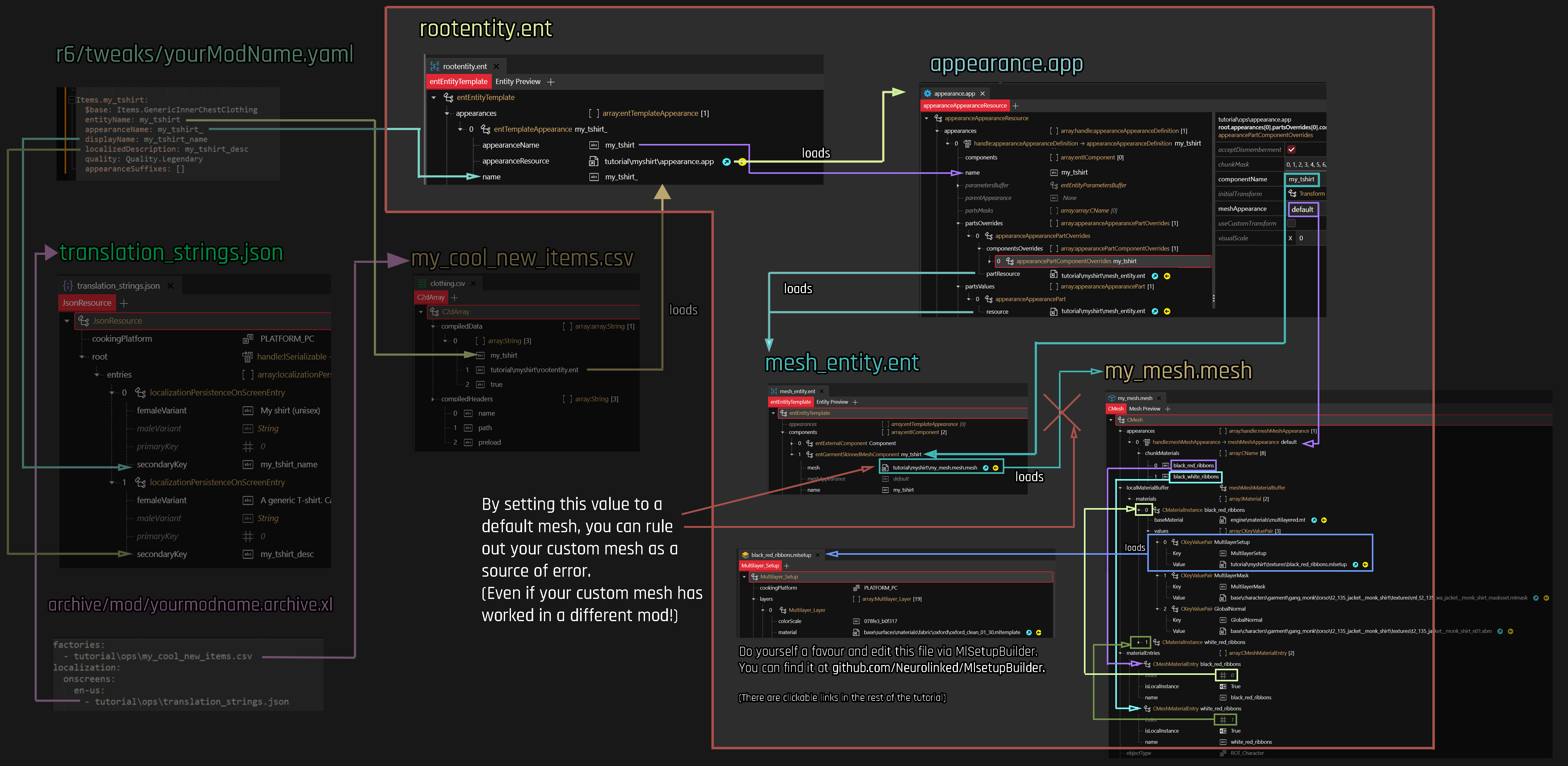 appearance.app: Check thepartsValuesandpartsOverridesentries. They need to point at themesh_entity.ent, not at the mesh.mesh_entity.ent: Does thecomponententry point to a valid mesh? Try it with a default mesh as detailed above.