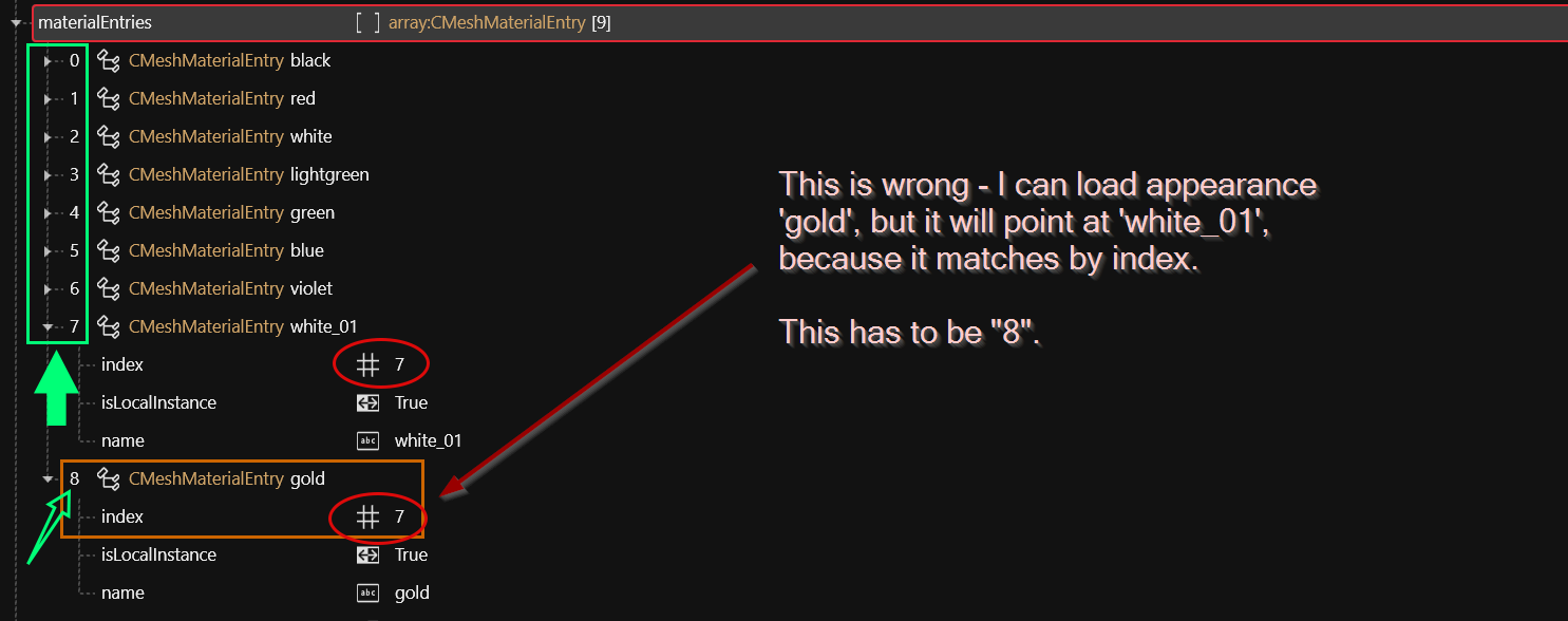 CMeshMaterialEntryinmaterialEntriesand check the propertyindex— it needs to be0. -