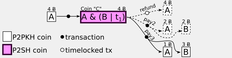 With a regular Spilman channel, this gets a bit better but the payment channel coin is still locked in a P2SH script, for a 2-of-2 multisignature. I didn't illustrate this, but you can imagine the above but "A & B" inside the pink box.