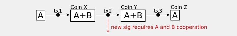 - Thus, a distinct signature can only be created by starting the entire signing process over again, including Alice's cooperation. Alice would of course only want do this if she has first secured a new tx3'.