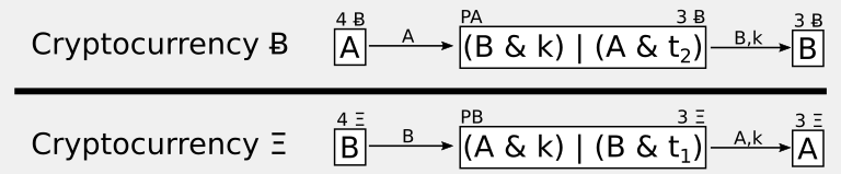 A: a valid signature from a key owned by Alice.B: a valid signature from a key owned by Bob.k,k1,k2, etc.: a correct unlock value (a preimage of given size that reproduces a given hash).t1: a fallback time t1 has expired. (this is used for guaranteed refunds)t2: a fallback time t2 has expired. In all the examples below, t1 < t2 is required for security reasons.