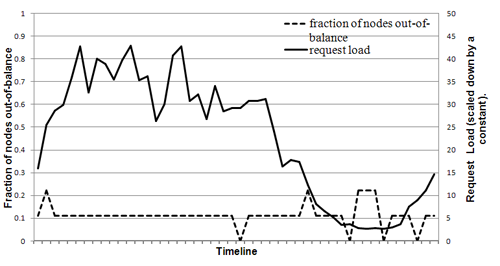 図6:バランスを崩したノードの割合(すなわち、リクエスト負荷が平均のシステム負荷より一定量高いノード)とそれぞれのリクエスト負荷。X軸の目盛りは30分に相当します。