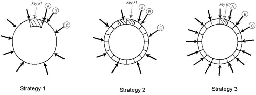 戦略2:ノードごとにT個のランダムトークンと同サイズパーティショニング: この戦略では、ハッシュ空間はQ個の同一サイズのパーティション/レンジに分割され、各ノードはT個のランダムトークンが割り当てられます。Qは一般的に Q >> N and Q >> S*Tで、Sはシステムのノード数です。この戦略では、トークンはノードの順序つきリストを指すハッシュ空間の値をマップする機能を構築するためだけに使われ、パーティショニングを決定するためには使われません。パーティションは、パーティションの終端からコンシステントハッシュリングを時計回りに探索するときに遭遇した最初のNこのユニークなノード上に配置されます。図7はN=3におけるこの戦略を図示します。この例では、ノードA,B,Cはキーk1を含むパーティションを終端から探索しているときに遭遇します。この戦略の主要な利点は:(i)パーティショニングとパーティション配置が粗結合、(ii) 実行時に配置手法の変更が可能になる、です。