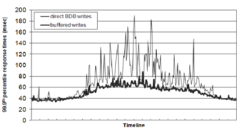 この最適化は、数千オブジェクトのとても小さなバッファの場合でも、ピークトラフィック時に99.9パーセンタイルレイテンシを5倍縮小します(図5を見よ)。図のように、writeバッファリングは高いパーセンタイルを平均化します。もちろん、この手法は永続性とパフォーマンスをトレードしています。この手法では、ひとつのサーバークラッシュがバッファにキューされたwriteの喪失を招く恐れがあります。永続性のリスクを減らすため、writeオペレーションはNレプリカのうちから"durable write"を行うコーディネーターを持つように改良されています。コーディネーターはW個のレスポンスしか待たないので、writeオペレーションのパフォーマンスは各レプリカで行われるdurable writeオペレーションのパフォーマンスの影響を受けません。