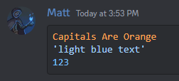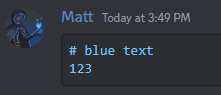 Discord also supports code blocks as well. You can make your own code blocks by wrapping your text in backticks (`)
