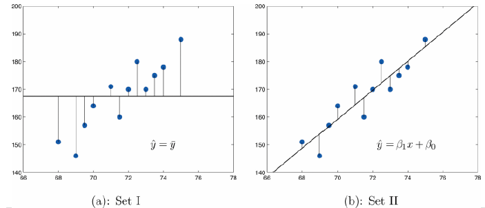 $A$ ) Set I. SSE < Set II. SSE (SSE: sum of the squared errors) ($B$ ) A random pattern of residuals supports a linear model. *($C$ )$y=\beta_1x+\beta_2$ , Set I.$r^2=0$ and Set II.$r^2>0$ ($D$ )$y=\beta_1x+\beta_2$ , Set I.$r^2<0$ and Set II.$r^2=0$ ($E$ ) none above. -