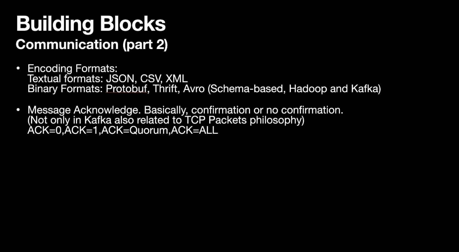 - Binary: Protobuff, Thrift, Avro (Schema-based, Hadoop and Kafka)