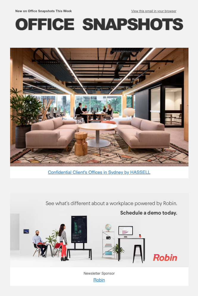 Hi – I wanted to touch base about Robin's upcoming banner spots (both header and footer) in Office Snapshots' newsletter. Ideally we would like to have the items below two days from now so we have enough time to queue them into the system.