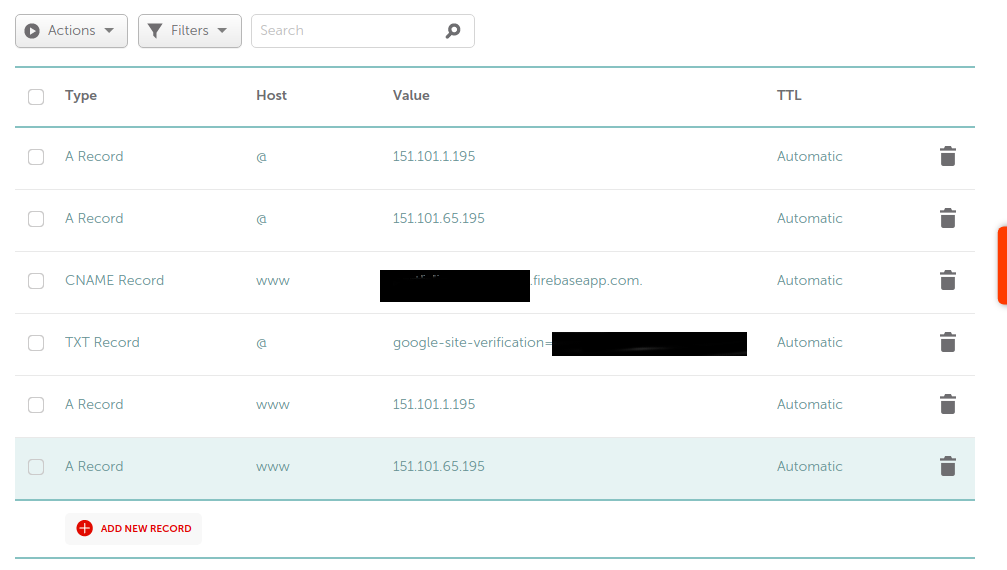 type: A Record host: @ value: copy from Firebase's dashboard TTL: Automatic - Remove the default