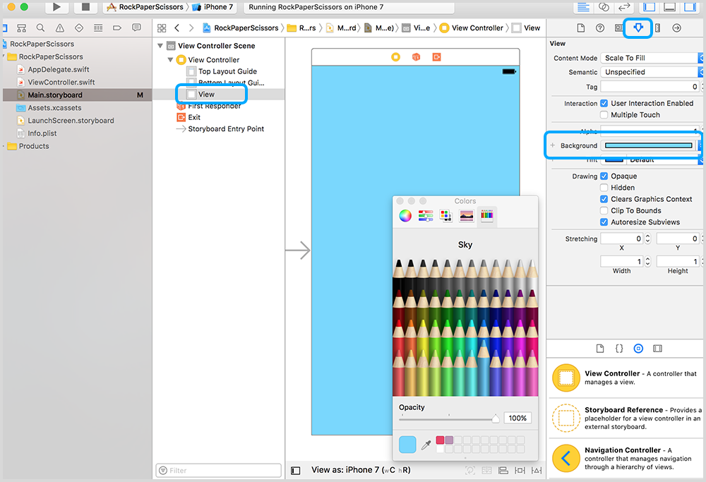 ViewControllerand select theViewobject. - Open the right hand side panel and make sure that the attributes inspector is selected. The attributes inspector is where you can modify the appearance of the view.