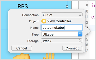 propertyas the connection type, name your propertyoutcomeLabel, and clickconnect. This will create a new property in your swift file. Properties can be accessed by all the functions inside the View Controller.