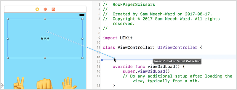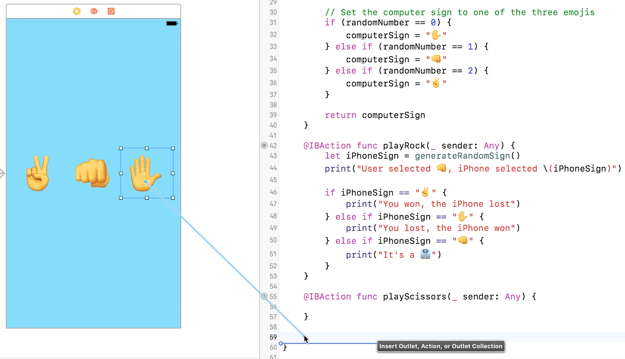 playRockfunction that's connected to your button and call thegenerateRandomSign()function to get a sign for the iPhone. - Save the result of this function in a constant called