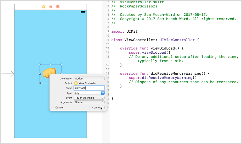 actionis selected as the connection type, name your actionplayRock, and clickconnect. This will create a new function in your swift file.