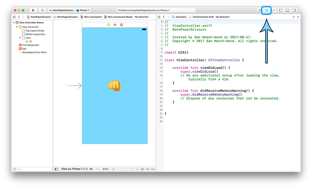 - Open the assistant editor, to show the code next to the storyboard.