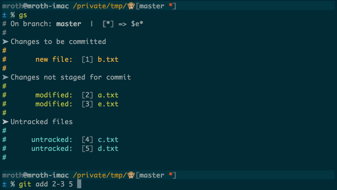 A must-have for any command-line Git user. Provides short numeric shortcuts for changed file names, so you can easily reference files in your git operations. (scmpuff is basically a simplified and more robust single-file binary version of scm-breeze)
