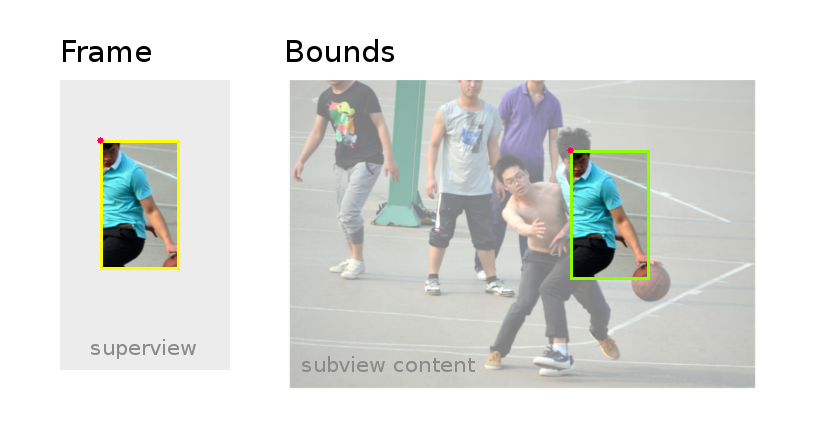 - bounds = a view’s location and size using its own coordinate system (important for placing the view’s content or subviews within itself)