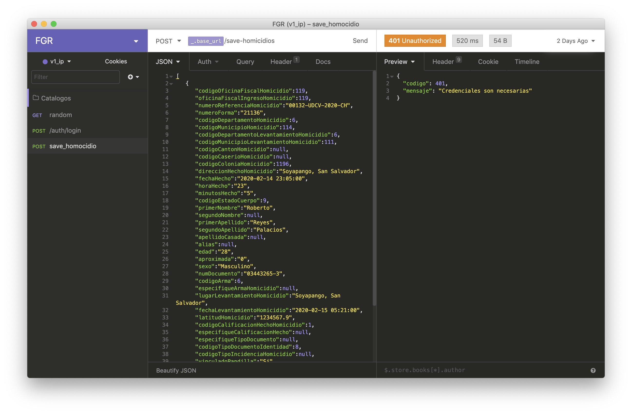 - Intentando crear un homicidio me genera un error 401 y con el siguiente json error: