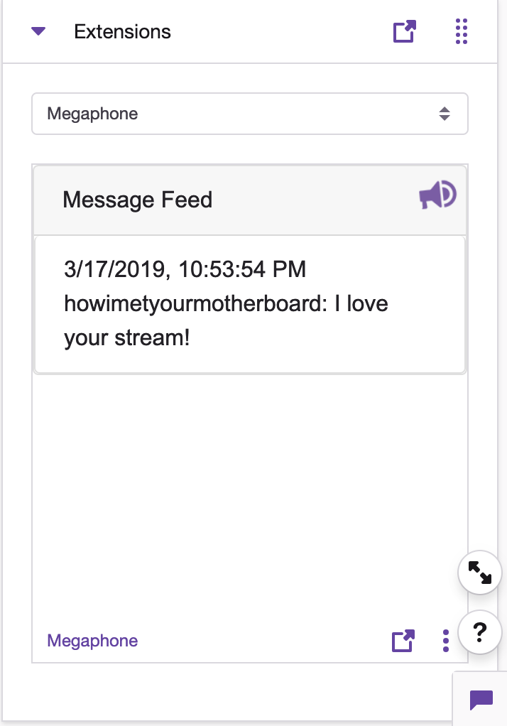 - Go to your dashboard live page. This is located at https://www.twitch.tv/\<your username>/dashboard/live You should see the Megaphone extension's Message Log panel under the "Extensions" section of this page. This panel will also play the text-to-speech messages as they come live from your viewers.